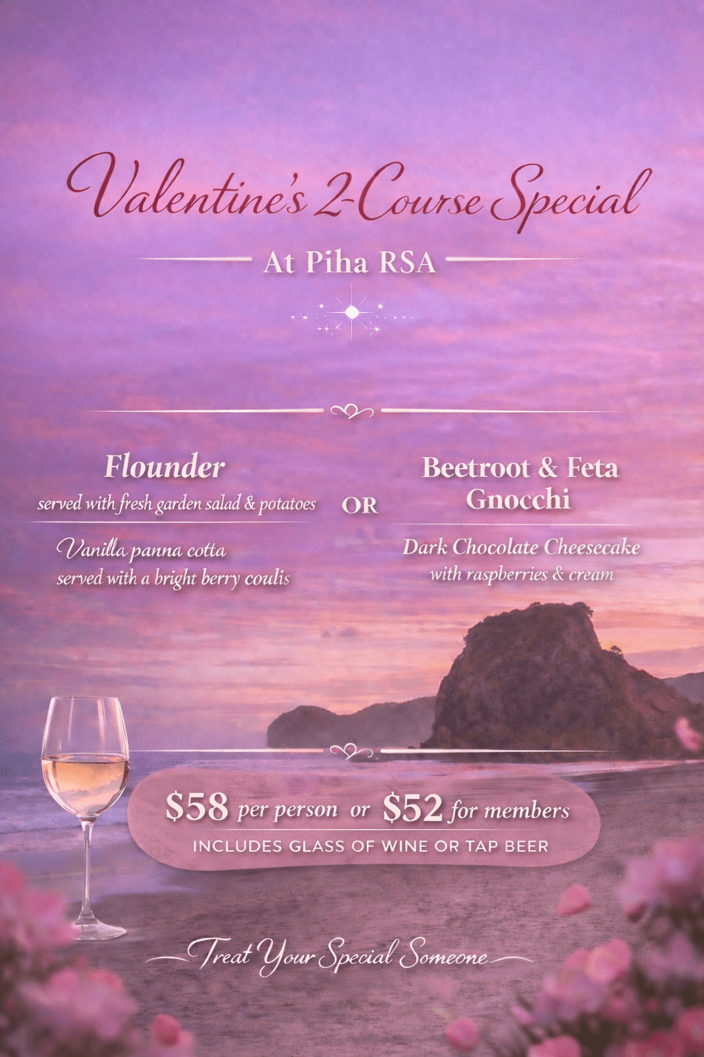 Drop into the Piha RSA for great value and great tasting food all day long. Bring the family, friends or take food home to enjoy.