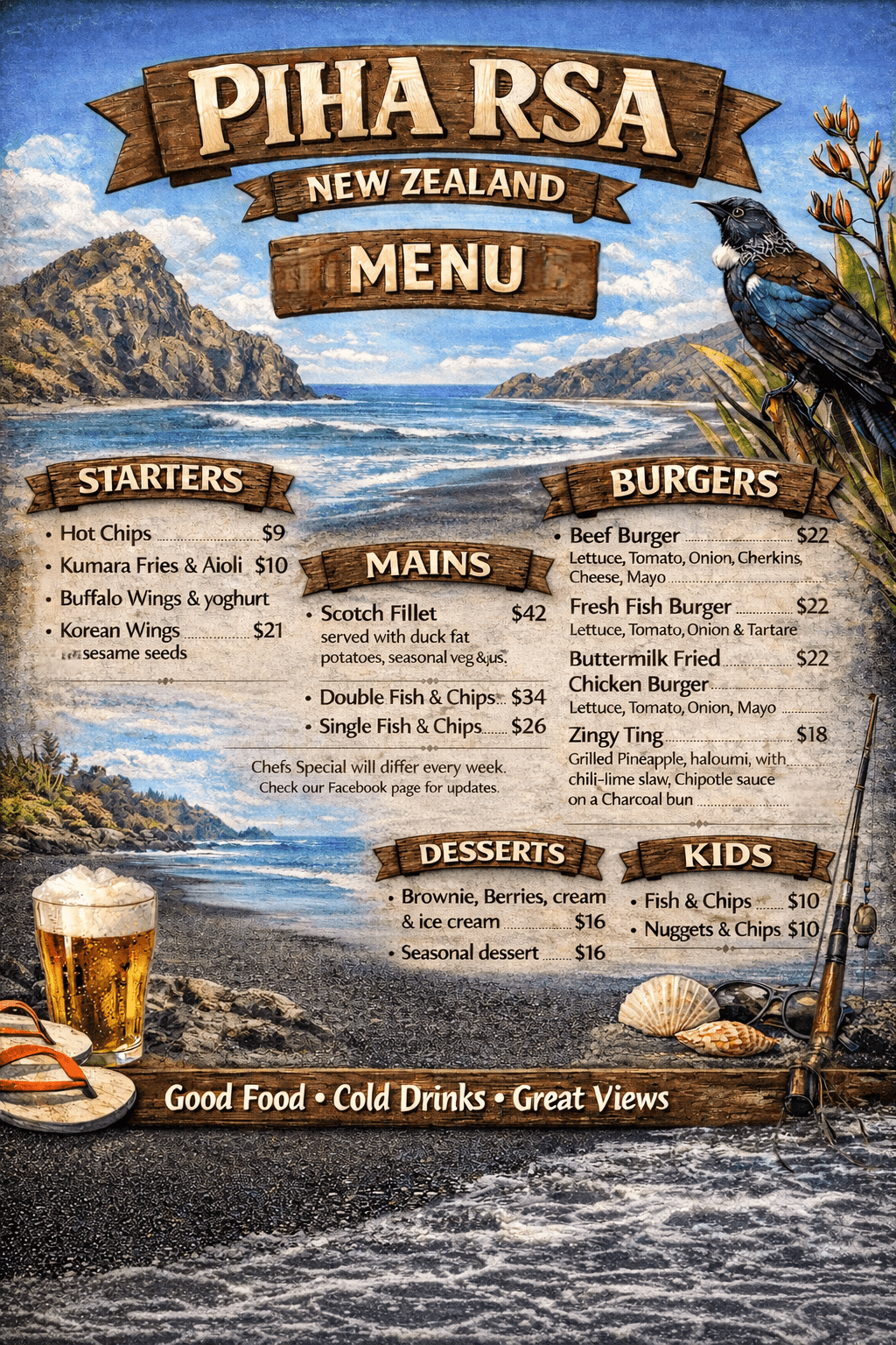 Drop into the Piha RSA for great value and great tasting food all day long. Bring the family, friends or take food away and enjoy at home.